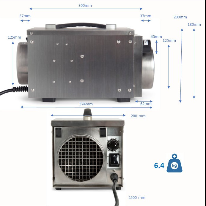 De invoerproceslucht wordt door stof gefilterd en gedroogd. Invoerlucht kan naar binnen en naar buiten worden geleid met een kanaal van 125 mm / 5 ". De afvoer van natte lucht is een kanaal van 40 mm / 1,5 inch.