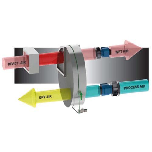 De luchtontvochtiger werkt met twee luchtstromen: de hoofdluchtstroom, de PROCESLUCHT die wordt gedroogd en een tweede, kleinere luchtstroom voor het regenereren van het rotormateriaal. Zijn twee, zeer efficiënte motoren met ventilatoren, creëren de afzonderlijke luchtstromen in tegengestelde richting.