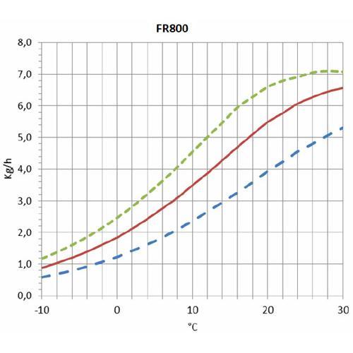 De tabel geeft weer hoeveel liter vocht luchtontvochtiger Fral FR800 bij diverse omstandigheden uit het binnenklimaat verwijdert.