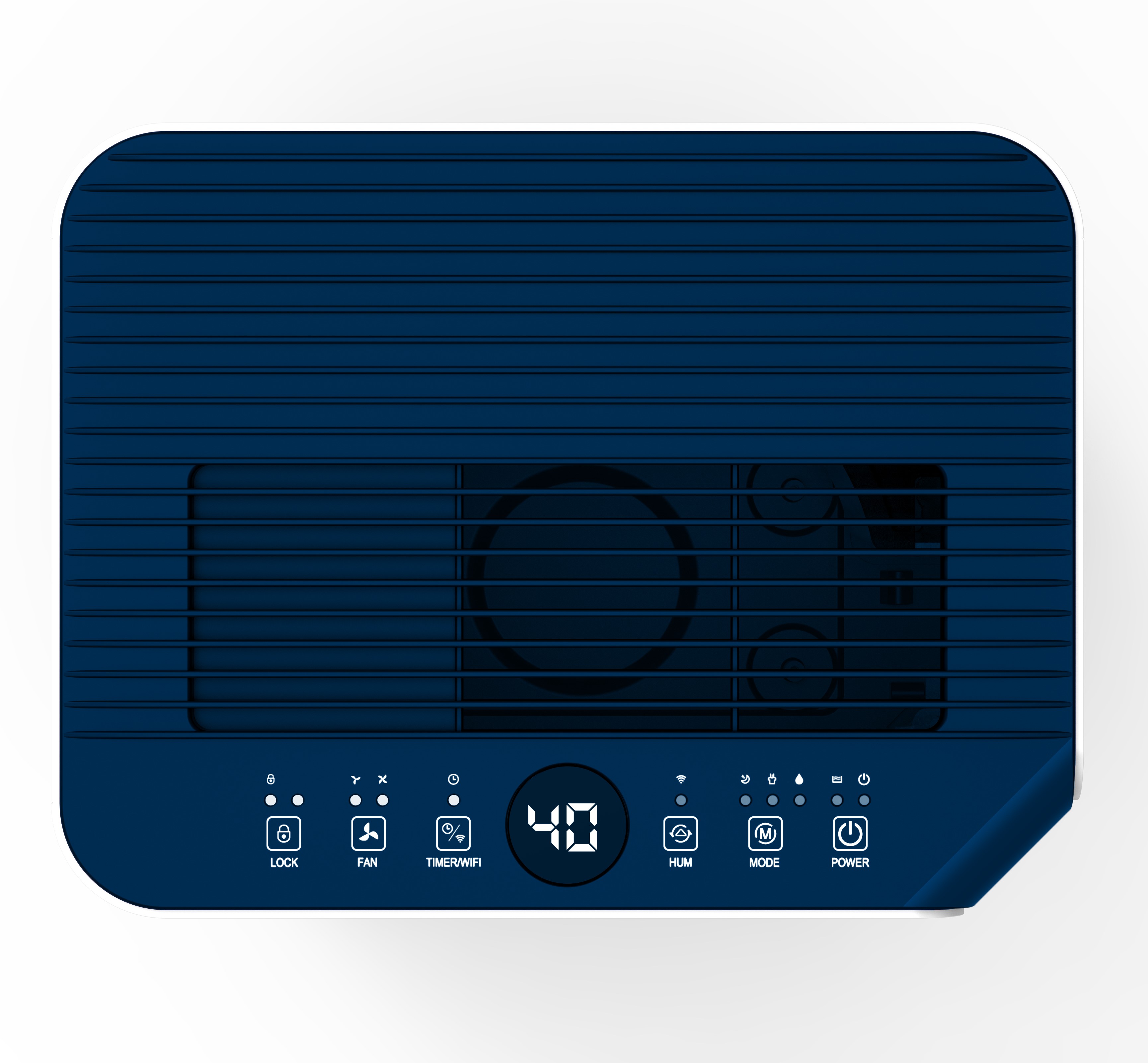 De matte, puur witte afwerking, verfraaid met blauwe details, maakt het een apparaat dat zowel vrolijk als aangenaam is in elke omgeving. Een dunne LED in de blauwe hoekstrip signaleert intelligent het vochtigheidsniveau op elk moment.