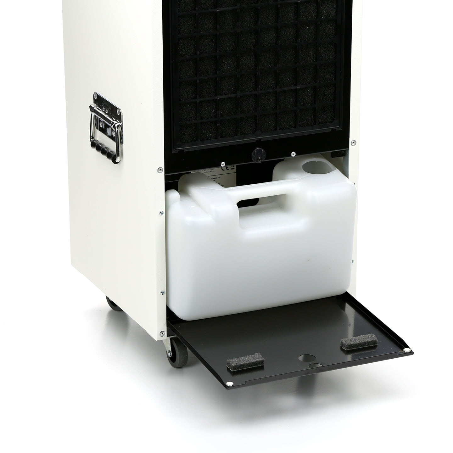 Deze professionele ontvochtiger heeft een verstelbare luchtvochtigheidsmeter en ook een aansluitkoppeling van 3/4" voor een vaste waterafvoer en een optie voor een opvoerpomp / condenspomp. Het ijzeren frame en de metalen omkasting zijn zeer sterk.