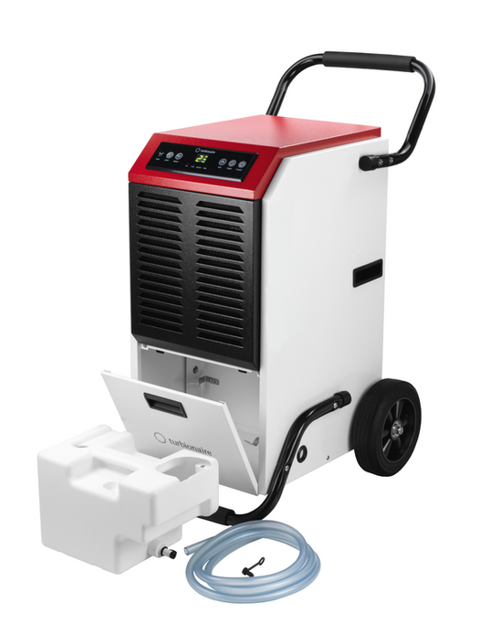 Professionele luchtontvochtiger Turbionaire PRO 70N voorkomt vochtproblemen en verhelpt waterschade in diverse gebouwen. Bouwdroger PRO 70N verwijdert tot 70 liter water per dag uit de lucht. De krachtige ontvochtiger beschermt gebouwen en hun inhoud tegen de schadelijke effecten van een hoge luchtvochtigheid. Met een uitneembare watertank en de mogelijkheid voor automatische afvoer van het opgevangen water. Turbionaire PRO 70N heeft een stevige constructie en sterke behuizing, de verrijdbare luchtdroger droogt onder zware omstandigheden.